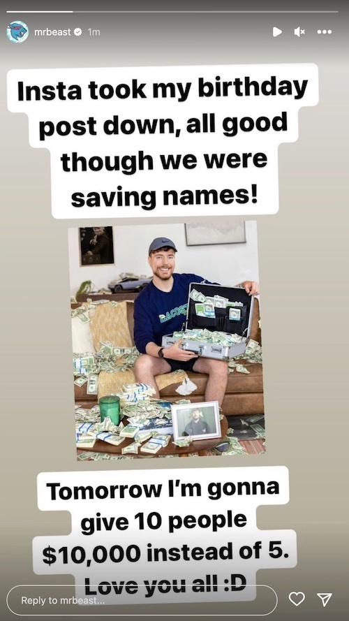 The post's removal was confirmed by MrBeast when he posted an Instagram Story with the same photo he used for his post and a text that says, "Insta took my birthday post down, all good though we were saving names!"