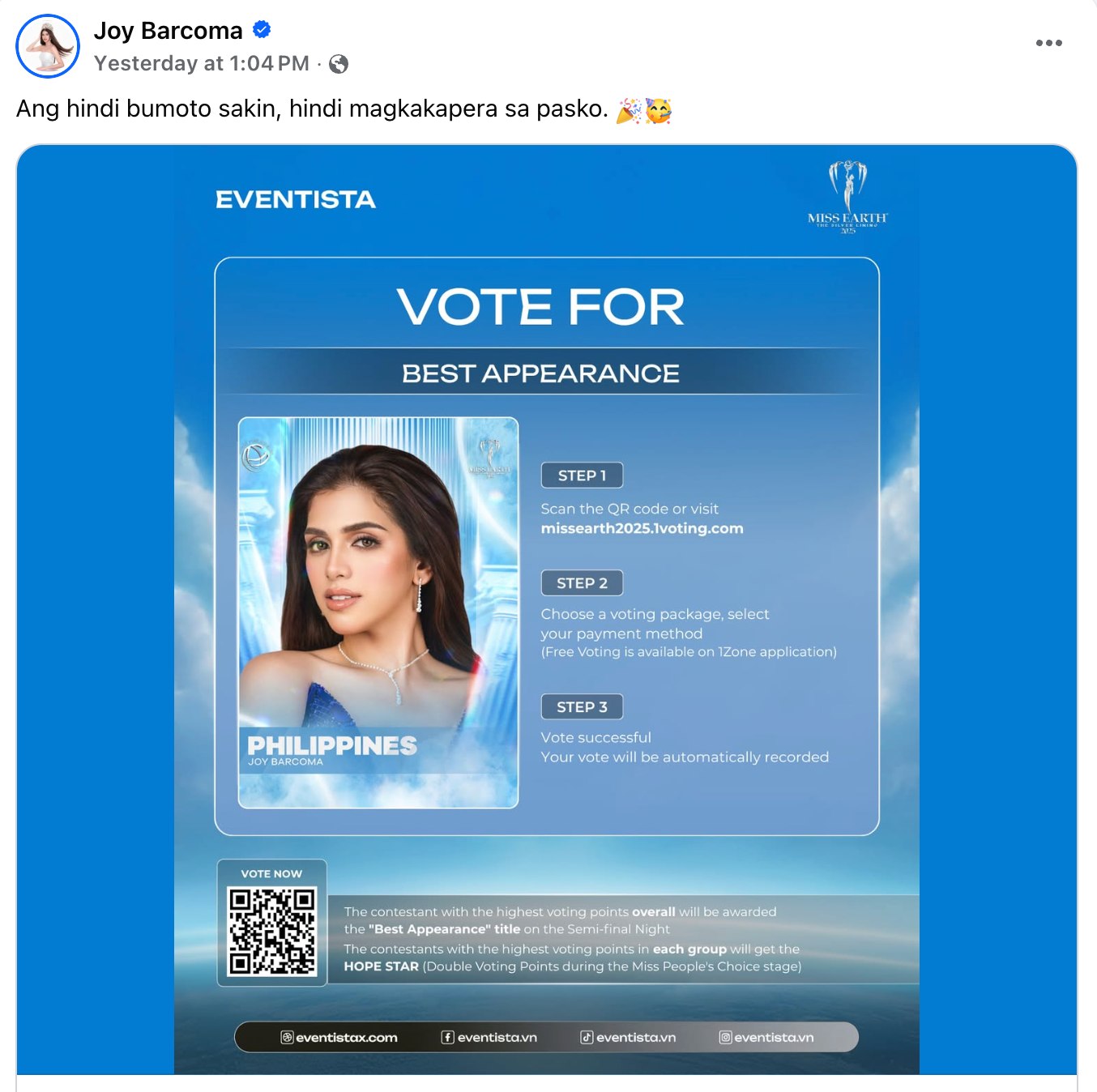 For instance, she shared a post from Miss Earth about how to vote for her for Best Appearance with the caption, "Ang hindi bumoto sakin, hindi magkakapera sa pasko."