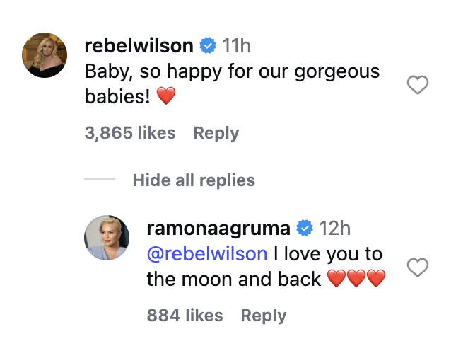 "The happiest news in our family. It will be four of us soon! Baby number two is on her way! I love you Rebel Wilson," she captioned her post.