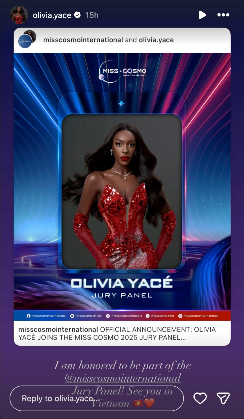 "Stepping onto the Miss Cosmo stage for the very first time, Olivia Yacé brings with her a legacy defined by brilliance, resilience, and the unshakable power of identity," the Miss Cosmo Organization wrote in the caption.