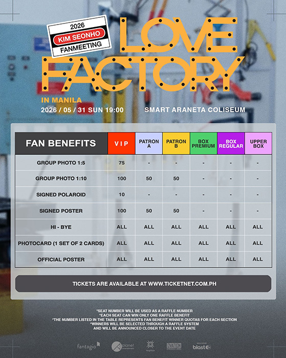 Other fan benefits for select patron guests include a group photo and signed posters, while some VIP fans get group photos, and signed posters and polaroids. The seat number will be used as the raffle number to score benefits, and each seat can only enjoy one benefit. Winners will be announced closer to the event date.