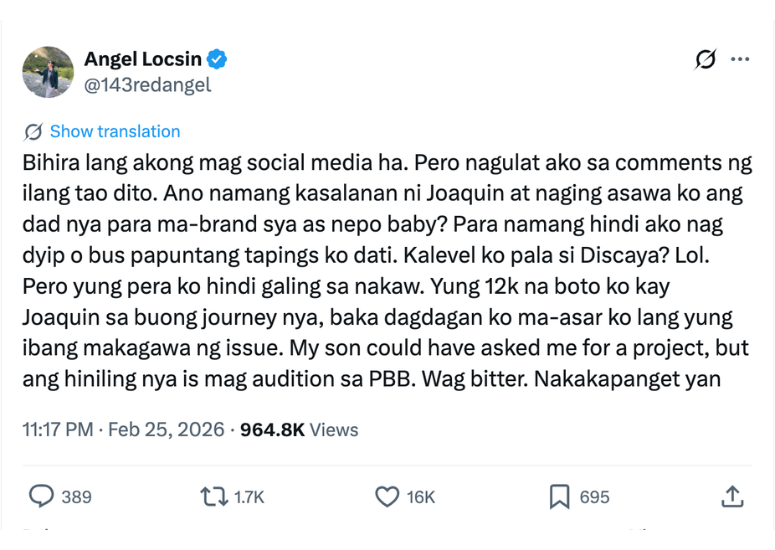 "Bihira lang akong mag social media ha. Pero nagulat ako sa comments ng ilang tao dito. Ano namang kasalanan ni Joaquin at naging asawa ko ang dad nya para ma-brand sya as nepo baby? Para namang hindi ako nag dyip o bus papuntang tapings ko dati. Kalevel ko pala si Discaya? Lol," she wrote.