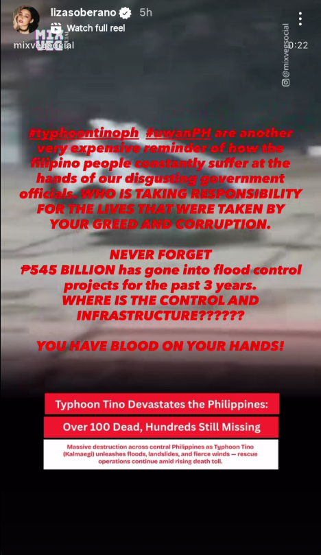 Meanwhile, actress Liza Soberano spoke out about how the recent typhoons are "another very expensive reminder[s]" of how "Filipino people constantly suffer at the hands of disgusting government officials."