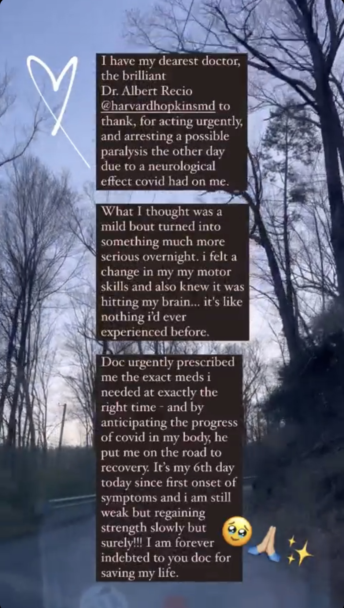 “Doc urgently prescribed me the exact meds I needed at exactly the right time and by anticipating the progress of COVID in my body, he put me on the road to recovery,” added KC.