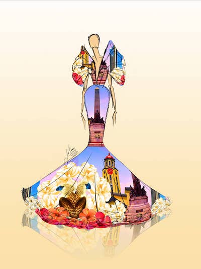 He continued, "The dress is made of thick silk that was printed with our customized digital pattern of iconic Manileño landmarks and national symbols like the Sampaguita and the Philippine Eagle." This is in addition to the Rizal monument and Manila City Hall Clock Tower printed on the gown's bodice and skirt.