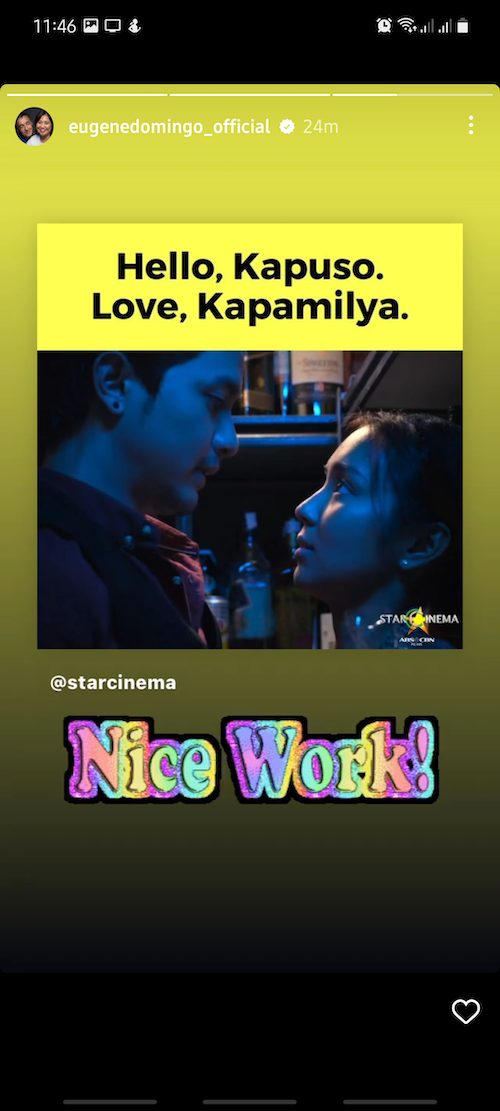 Comedienne and host Eugene Domingo posted an Instagram Story with a colorful GIF that says “NICE WORK.” Her movie Ang Babae Sa Septic Tank is expected to air in GMA together with the other blockbuster Star Cinema films.