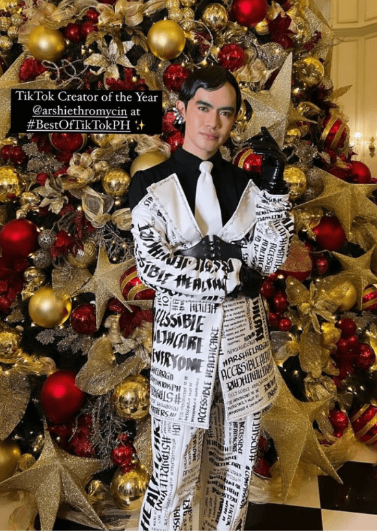 Known for his health and medical content, pharmacist-content creator Arshie Larga made sure to highlight his health advocacies in his outfit, which was designed with health-related words like “mental health,” and “accessible health care for everyone.” His look was done by hair and makeup artist Mycke Arcano and stylist Nash August. Arshie was named Creator of the Year during the TikTok Awards in September. He has 3.2 million TikTok followers as of writing.
