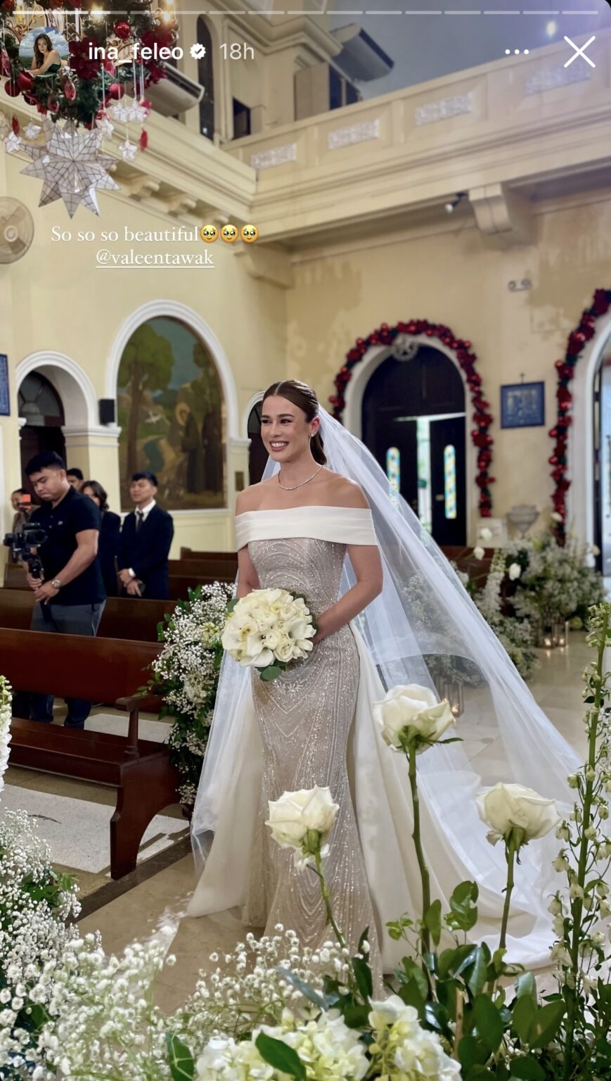 In an IG story by Ina Feleo, the now "Mrs. Manuel" can be seen walking down the aisle in a white off-shoulder gown.