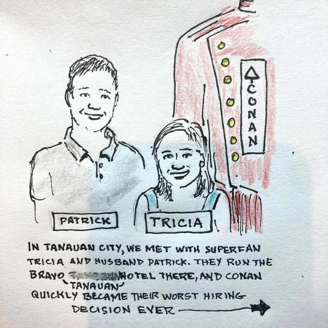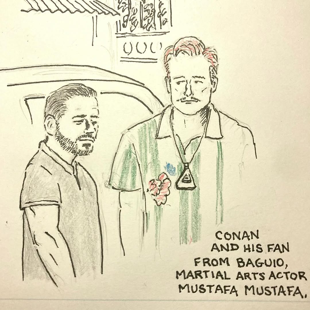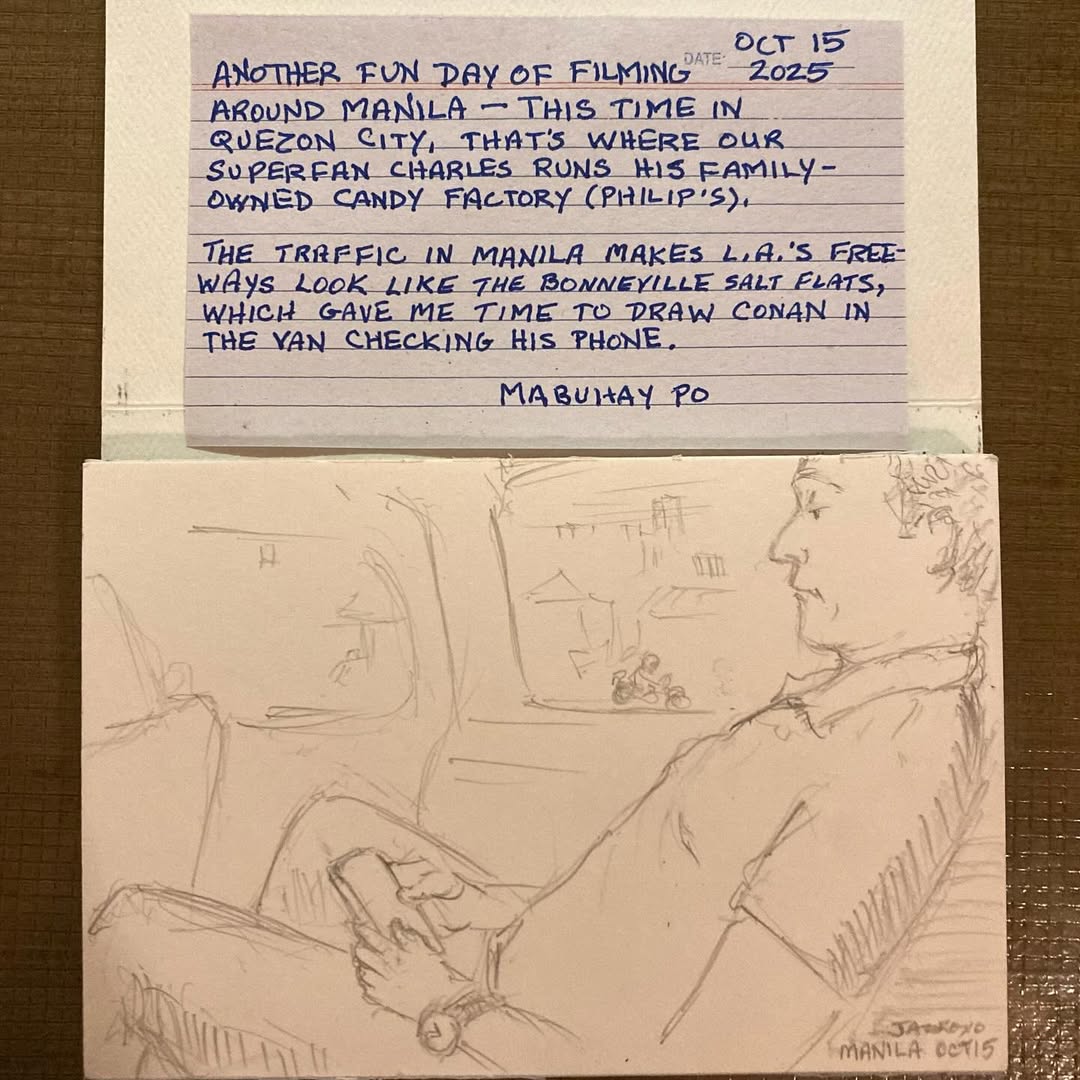 "That's where our superfan Charles runs his family-owned candy factory (Philip's). The traffic in manila makes LA's freeways look like the Bonneville Salt Flats, which gave me time to draw Conan in the van checking his phone," Arroyo said.