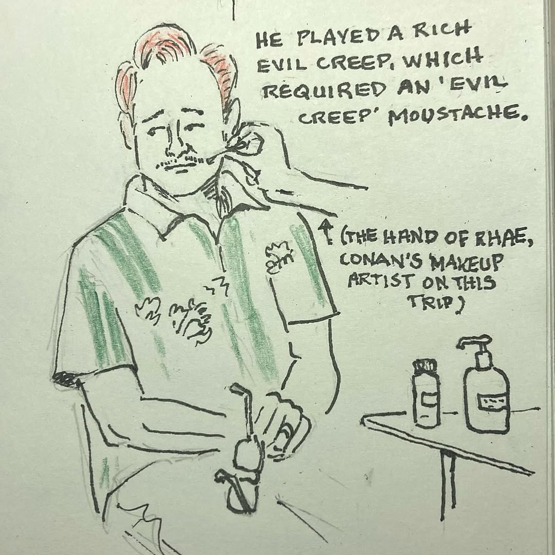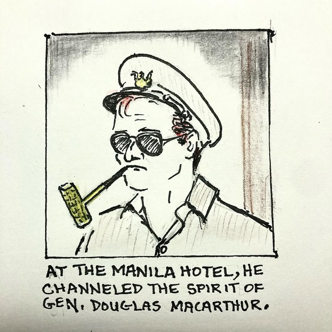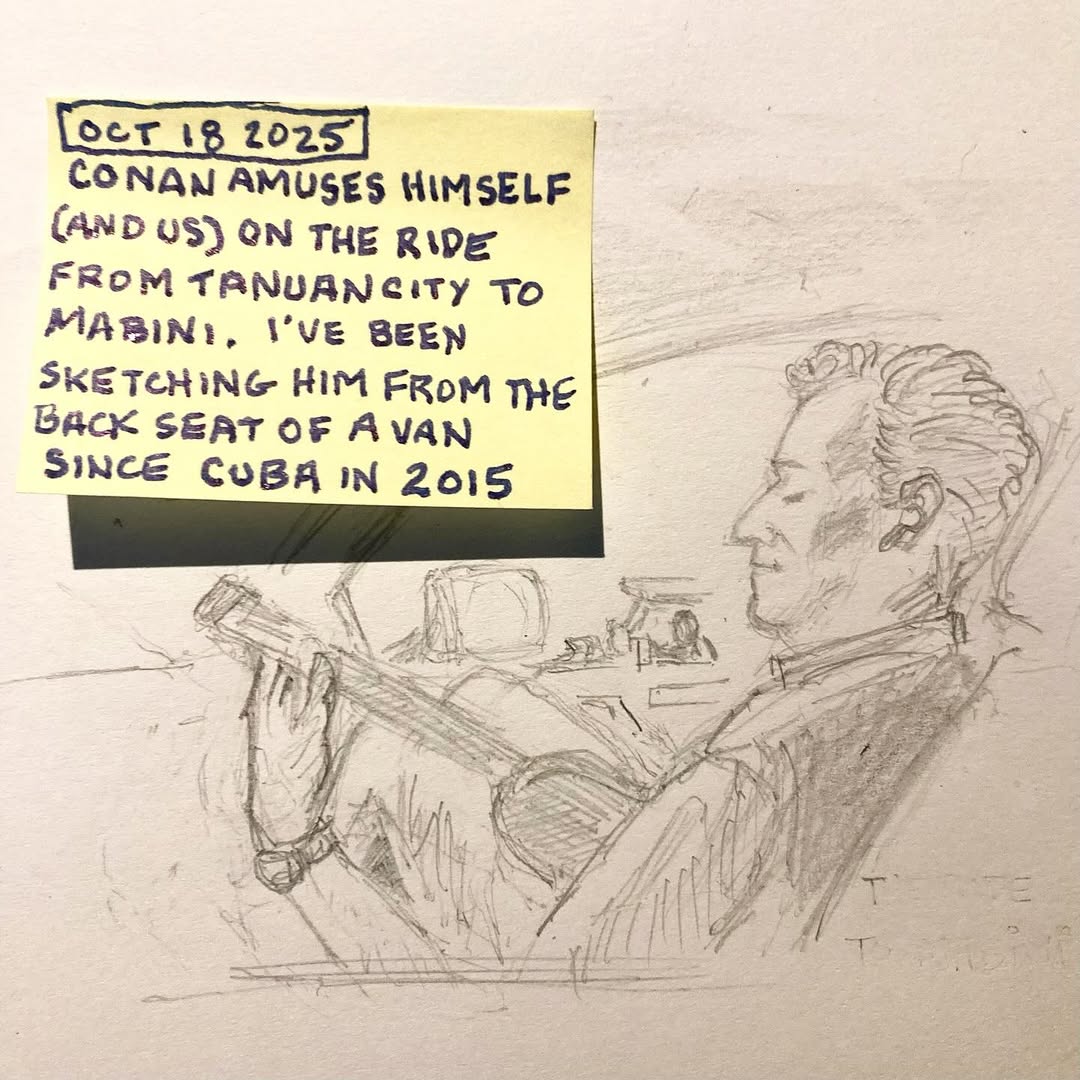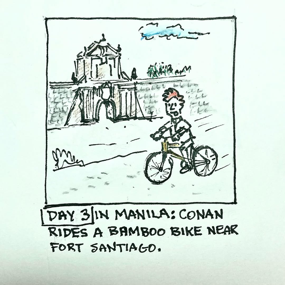 "That's where our superfan Charles runs his family-owned candy factory (Philip's). The traffic in manila makes LA's freeways look like the Bonneville Salt Flats, which gave me time to draw Conan in the van checking his phone," Arroyo said.