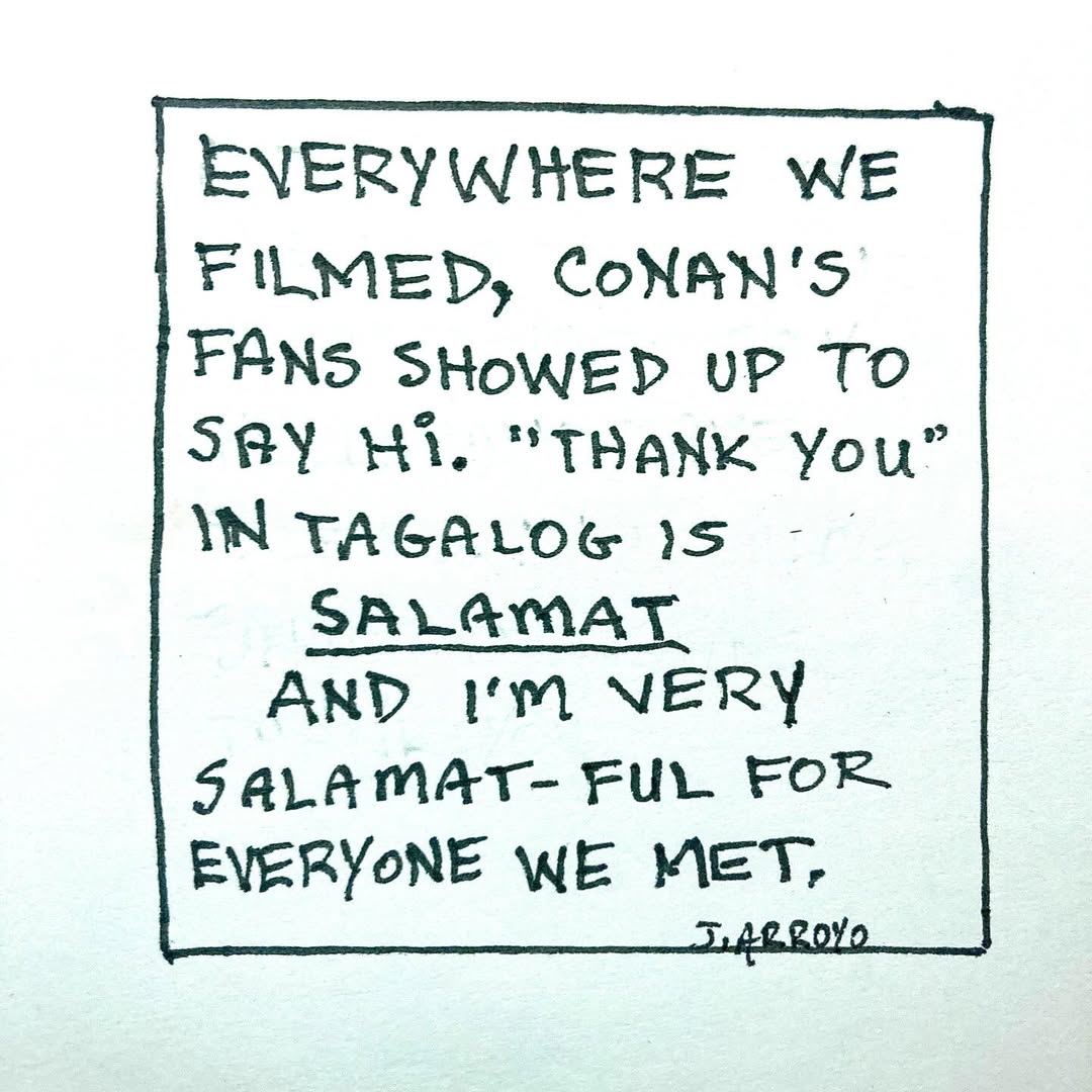 "At the Manila Hotel, he channeled the spirit of Gen. Douglas McArthur. Everywhere we filmed, Conan's fans showed up to say hi. 'Thank you' in Tagalog is 'Salamat,' and I'm very 'Salamat-ful' for everyone we met," Arroyo said.