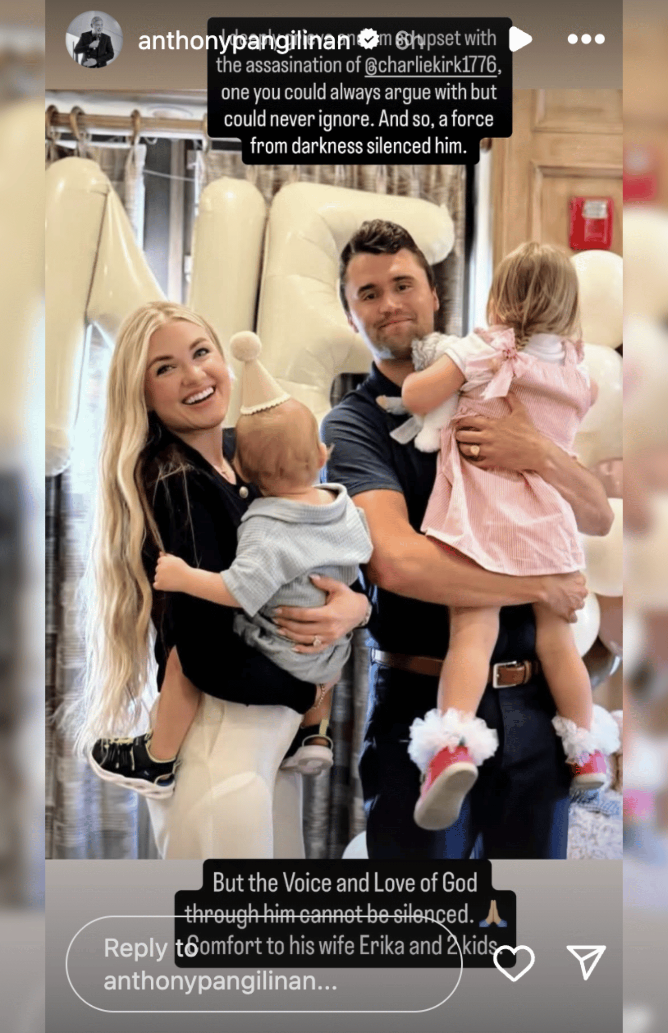 "I deeply grieve and am so upset with the assassination of [Charlie Kirk], one you could always argue with but could never ignore. And so, a force from darkness silenced him," he wrote on Instagram story, sharing Kirk's family photo.