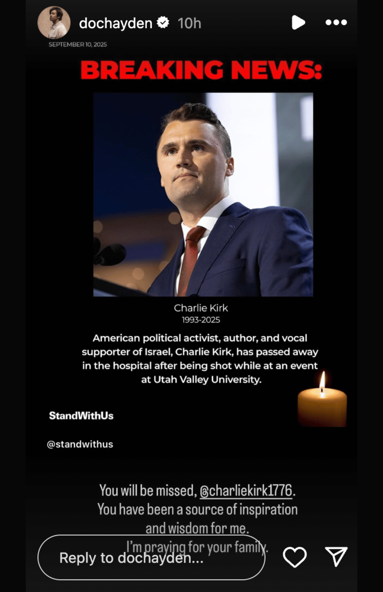 "You will be missed [Charlie Kirk]," he wrote. "I’m praying for your family."