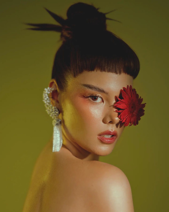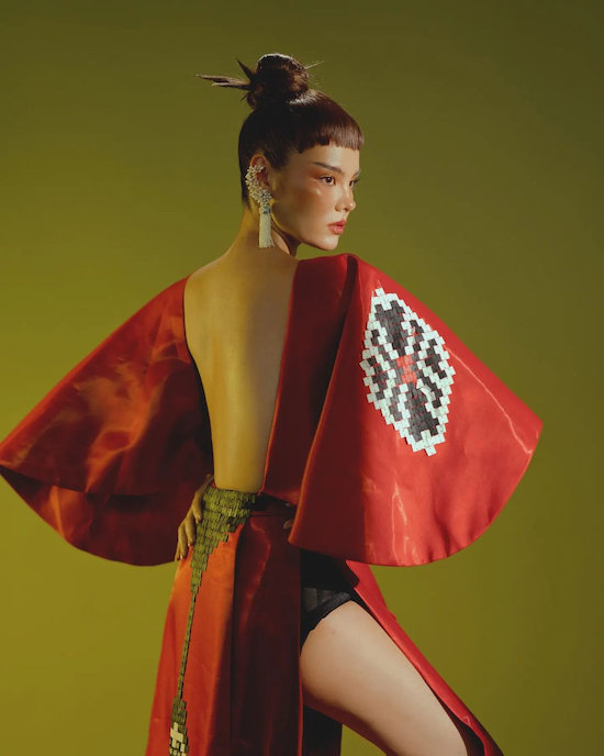 Completing Gray's Japanese-inspired outfit is a pair of red patent stiletto heels and white Serafina earrings by Filipino fashion accessories designer Farah Abu.