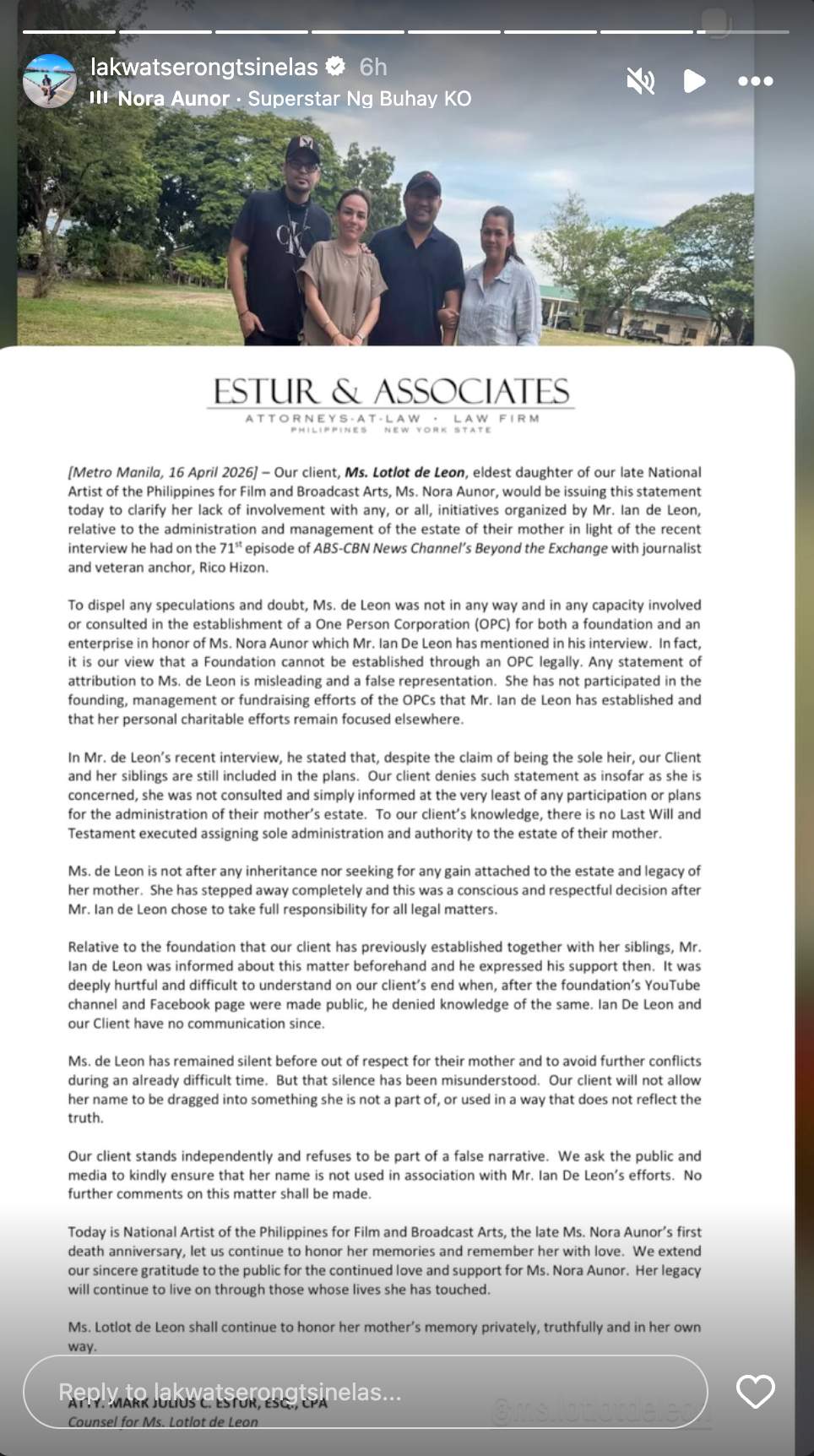 Lotlot de Leon has made it clear that she is not after the estate of her late mother, Nora Aunor, following remarks from her brother Ian de Leon describing himself as the actress’ “sole heir.”