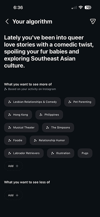 "We're starting to test a way for you to tune your algorithm on Instagram by adding and removing topics based on your interests," he wrote. "We're launching this feature on Reels first, with plans to expand to Explore soon."