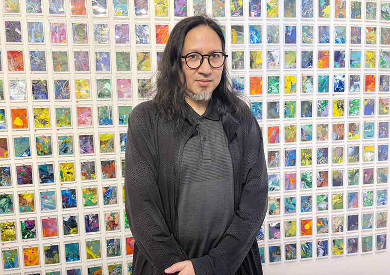 From a distance, the tiny sleeved canvases also remind one of Polaroids: separate moments encased in a flash memory. (Think of it as single-serving abstract art.) He says he chopped up some canvases to construct the wall mosaic but then added extra pieces: “If there’s a dead space in some area, it’s good for that small piece” to fit.