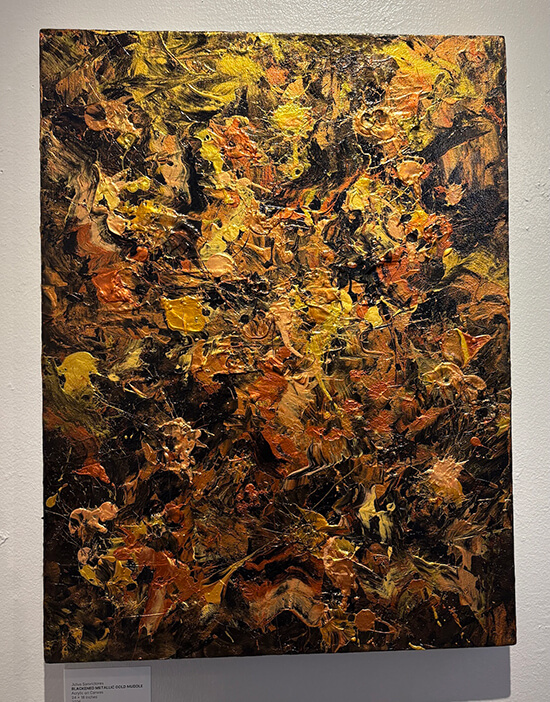 An abstractionist in a distracted world, Sanvictores has been seeking the thrum-beat of monochromatic tones and vivid horror vacui arrangements on layered canvases for over a decade. The nimble drummer from bands like The Black Vomits, Shoulder State and The Executives has even channeled his abstractions through a percussive workout involving paint spattering over stretched canvas (for last year’s “Brushstrokes and Backbeats”). Jazz—Miles Davis, Thelonious, etc.—is his main infusion, but lately he’s been grooving to Canadian math rock duo Angine de Poitrine and, whenever possible, “green noise”—the sounds of the natural world. “I listen to nature, even if it’s blank.”