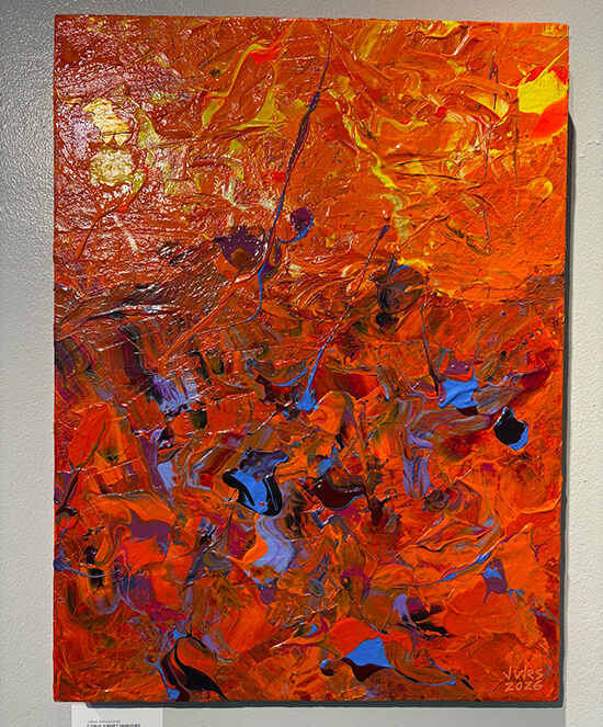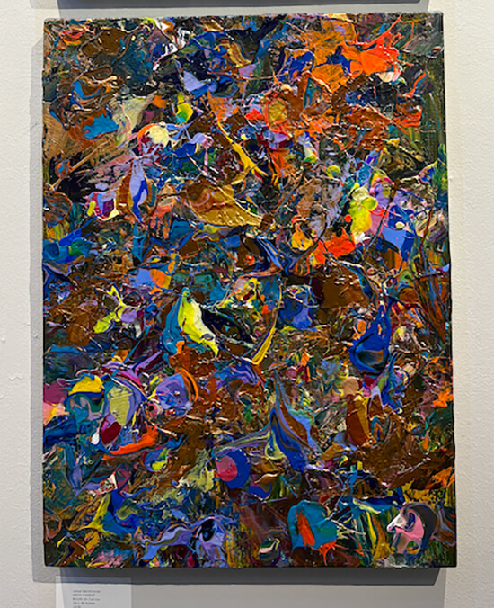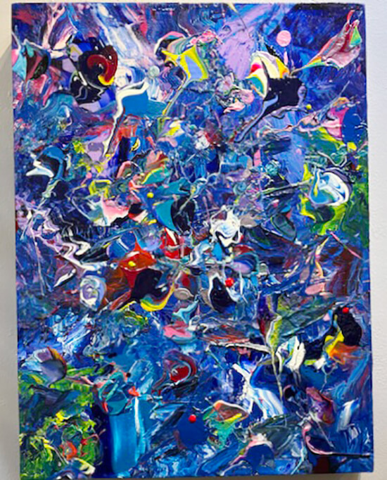 The larger canvases in “Postcards Against a Collapsing World” flash with heavy movements of thick acrylic, no longer using a brush: “I’m using mostly a palette knife, sometimes a squeegee.”