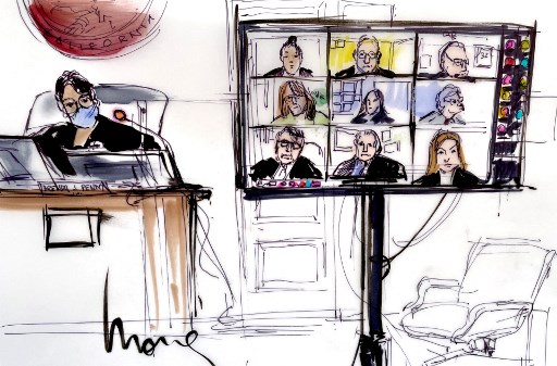 This courtroom sketch shows Judge Brenda J. Penny presiding over participants, virtually appearing on a screen, during the hearing of Britney Spears' guardianship case in the Los Angeles County Courthouse on June 23, 2021. (Mona Edwards/AFP)