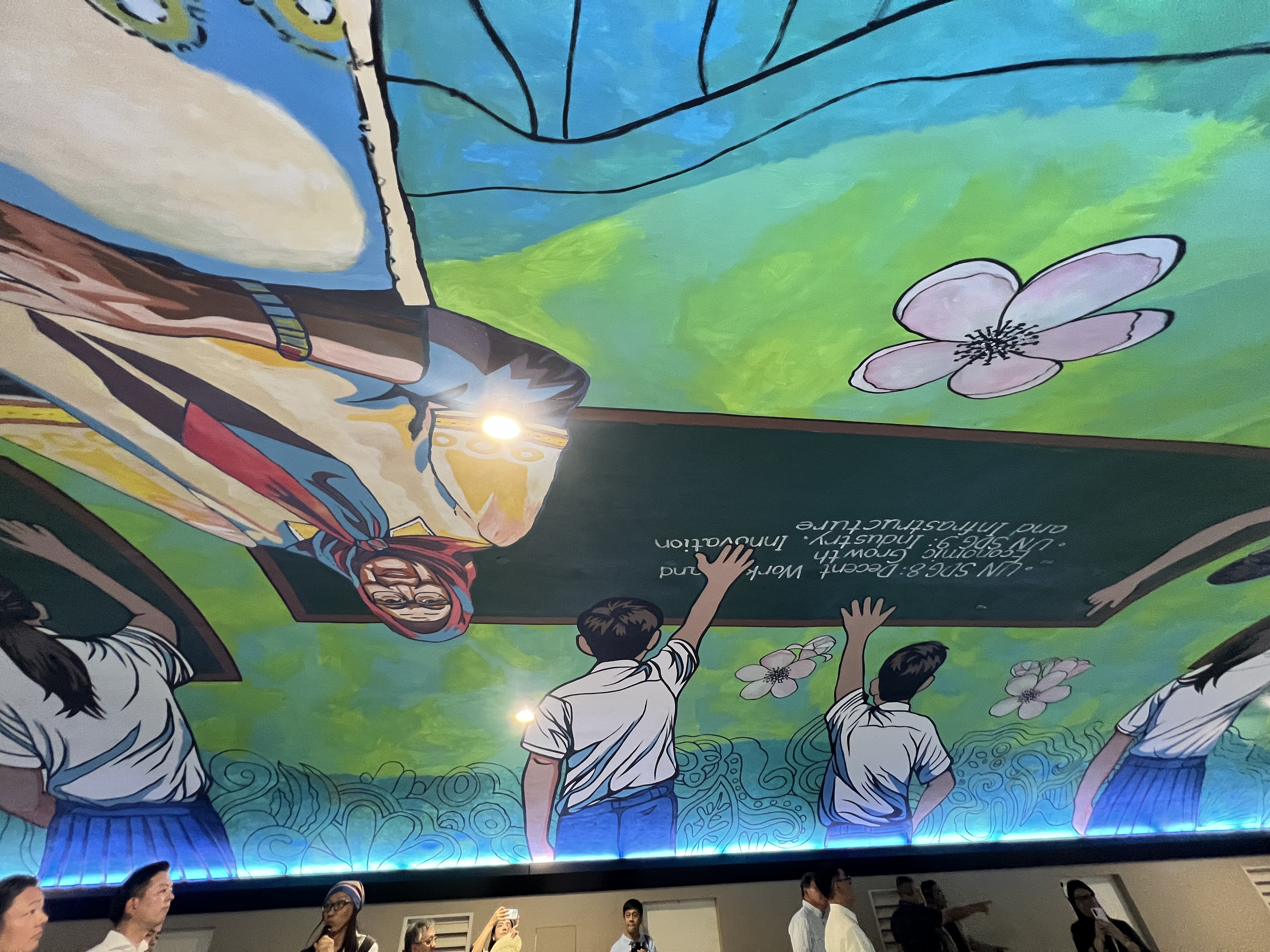 At the center is an image of a classroom, which Filipino artist AG Saño considers the emotional core of the mural. Rather than showing students face-forward, Saño painted viewers from behind, placing passersby directly into the scene.