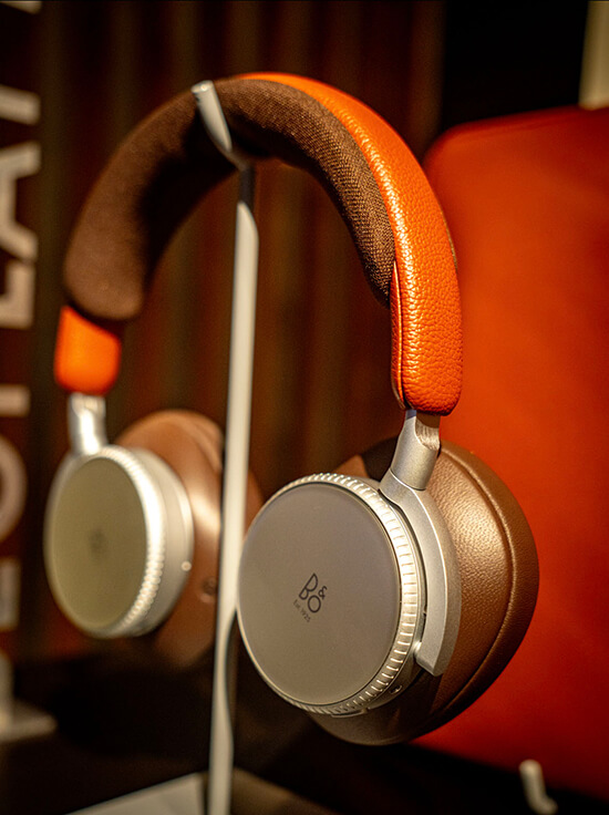 We step over to the Beoplay H100 Century Brown headphones, with rich, detailed sound coming from titanium drivers, Dolby Atmos tuning and advanced noise cancellation. The Century Red leather and Chestnut Brown accents are met with Century Blue touches and a sleek silver glass disc—a stylish display object for your desk or bedside, when it’s not on your head.