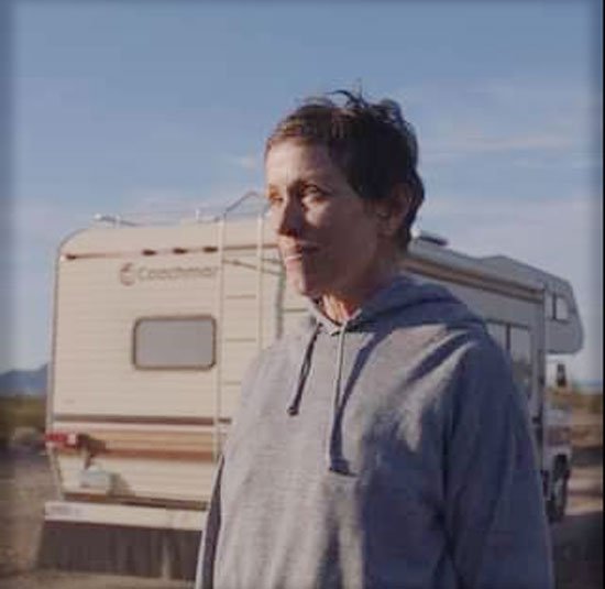 Frances McDormand plays Fern, a widow and former teacher who’s now reduced to working at Amazon packing plants across America for short-term contracts, living in her RV where she keeps remnants of the more rooted life she left behind — a set of wedding plates, an urn containing ashes — after her husband died and they lost their home in Nevada.