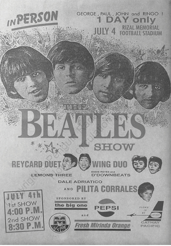 They did. The Beatles, who had concluded two hugely attended concerts on the afternoon and evening of July 4, 1966 at Rizal Stadium, suddenly found themselves personae non gratae after news reports blamed them for ignoring a Palace invite from Imelda; TV stations showed clips of empty chairs where the Beatles were supposed to be, along with a discontented First Lady and sad faces of children “disappointed” by the no-show. That image, reports Guerrero, is how the Beatles themselves learned of the coming storm, watching their TV sets in their hotel rooms.