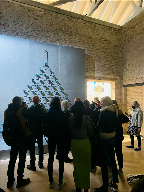 Five countries — Cameroon, Namibia, Nepal, Oman and Uganda — participate in the Art Biennale for the first time, while three others — Kazakhstan, Kyrgyzstan and Uzbekistan — participate for the first time with their own pavilion. The Russian Pavilion looks grandiose in its emptiness like the shell of a megayacht (as the curator and the two artists declined to participate in protest of Putin’s invasion), while visitors constantly troop to the Ukrainian Pavilion with Pavlo Makov’s “Fountain of Exhaustion” (a metaphor for “global exhaustion” from the pandemic, social media, depletion of the earth’s resources, war, everything). On the second day of the war, co-curator Maria Lanko packed the artwork’s component-funnels into her white Audi on a six-day, 10-hours-a-day backroad drive from Kyiv to Romania accompanied by a friend and her dog. (From there, she traveled to Budapest and then eventually ended up in Vienna.) Lanko could see the faraway fires of burning towns in the course of her escape. Meanwhile, Makov was holed up in a bomb shelter in Kharkiv. He would eventually make his way out of Ukraine with his wife and 82-year-old mother.