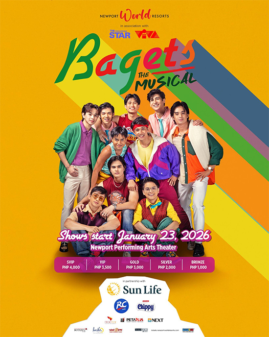 Bagets The Musical runs from January 23 to March 2026 at the Newport Performing Arts Theater. Tickets are now available at Newport World Resorts Box Office, Ticketworld, and Ticket2Me: PHP 4,000 (SVIP), PHP 3,500 (VIP), PHP 3,000 (GOLD), PHP 2,000 (SILVER), and PHP 1,000 (BRONZE). For inquiries, contact Customer Care at 7908-8888.