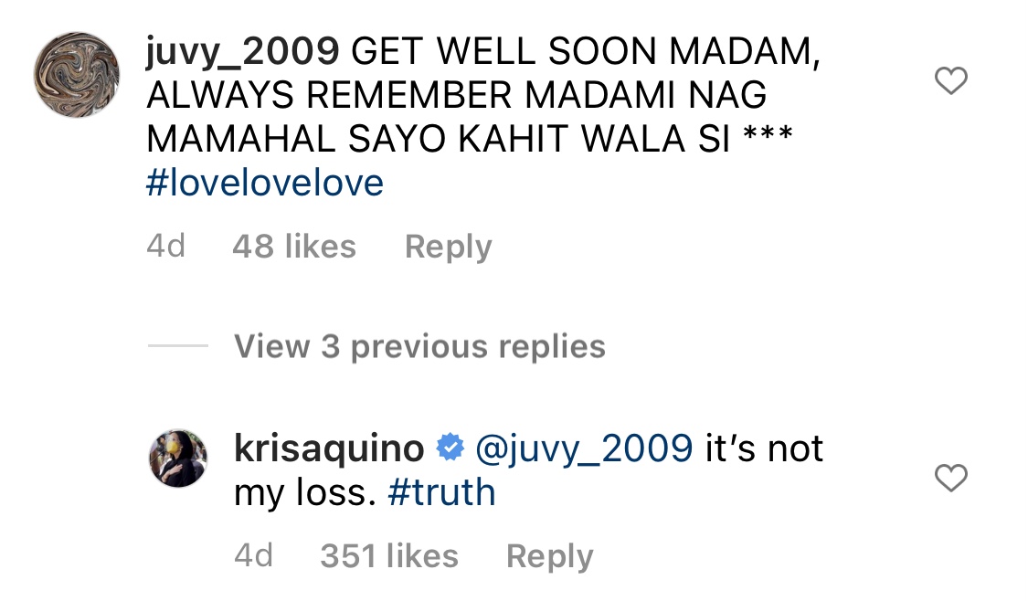 Aside from the support she received from her nearest and dearest, netizens were also quick to send her some love. “GET WELL SOON MADAM, ALWAYS REMEMBER MADAMI NAG MAMAHAL SAYO KAHIT WALA SI ***,” an IG user wrote in the comment section, with the hashtag #lovelovelove. Seemingly alluding to Sarmiento, who has a three-letter first name, Aquino gave a straightforward response, saying it’s not her loss.