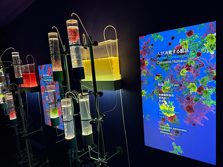 The “Currents Towards the Future” zone of the pavilion showcased Spain’s cutting-edge research on the commercial potential of utilizing marine resources sustainably toward a circular, resource-efficient economy. Algae-based innovations were on exhibit for their multiple potentials. As food, these marine microorganisms can be a sustainable source of protein, vitamins, and minerals for human consumption. As animal feed, the highly nutritious and sustainable substitute can replace conventional sources. The bioactive compounds in algae are utilized in cosmetics for anti-aging and moisturizing. Spain also has ongoing research on developing algae-based biofuels.