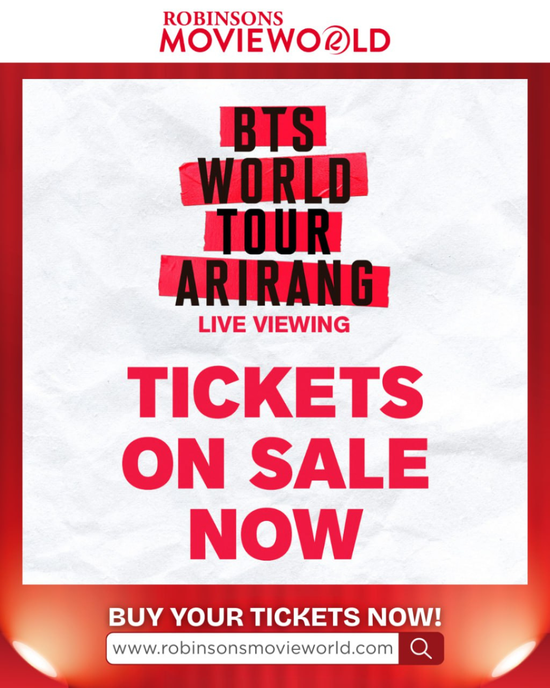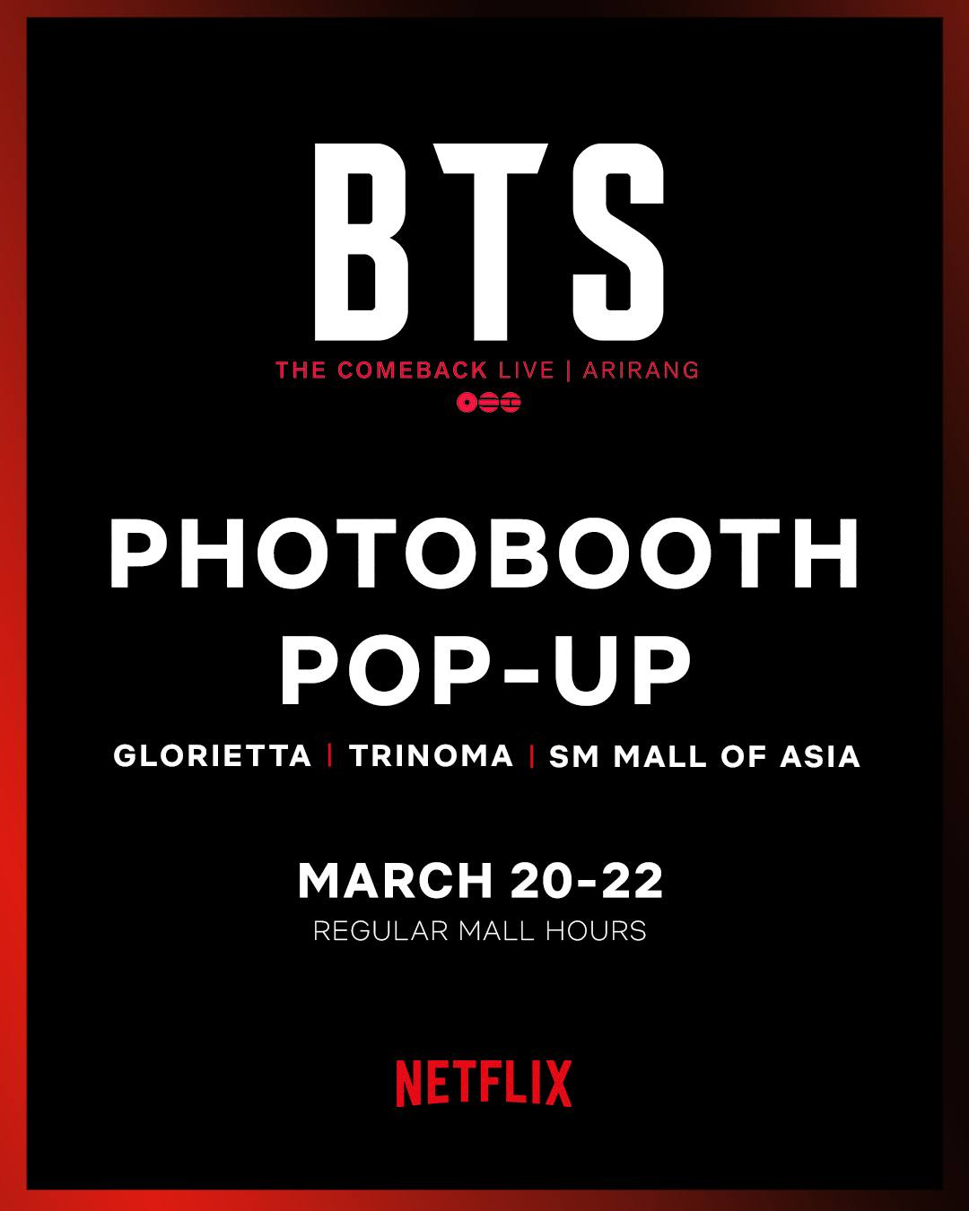There will also be a private watch party of the ARIRANG concert on March 21, 5:30 p.m. at MCDO Karuhatan, Valenzuela. You can also enjoy freebies, games, and raffles ahead of the show.