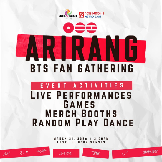 Meet fellow ARMY and join the "ARIRANG BTS Fan Gathering" happening on March 21, 3 p.m. at Level 3, Body Senses, Robinsons Metro East in Pasig.