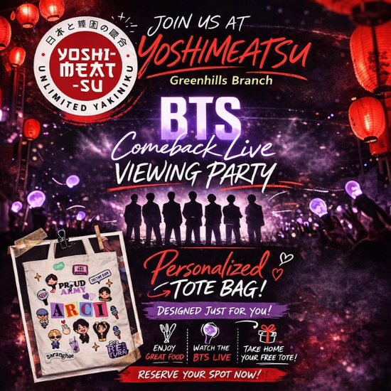 Love both BTS and samgyupsal? Enjoy the ultimate K-experience and join the watch party with fellow ARMY at Yoshimeatsu Unlimited Yakiniku!
