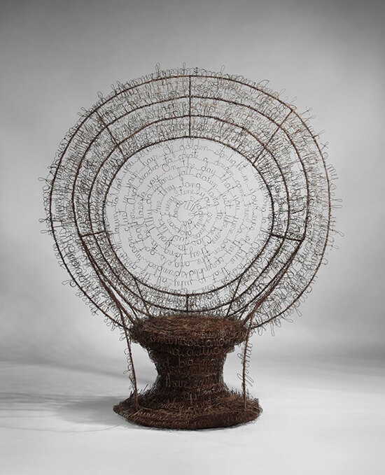 Back in the US, Filipino-American artist and landscape architect Cheyenne Concepcion decided to reclaim the peacock through her Reclaim furniture series that reconnects it to its Philippine origins and draws on her own Filipino-American identity while aiming to make it more functional by making it stronger, shorter, more comfortable and less fanciful—merging the organic look of Philippine buri with bold American metal. And her name for the chair? Nothing could be more apt than Doña, the family’s nickname for her lola, she says. “It is a chair for nobility but in our household, she’s kind of the noble one.”