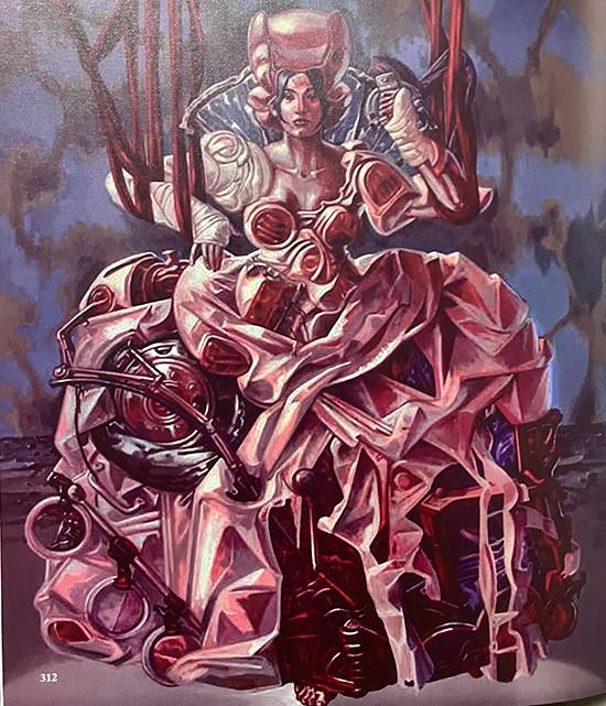 Performances became rife in 2003-05, and in terms of fresh stylized offerings, wooden wagons bearing replicas of mock cathedrals figured frequently in 2003-08. Ornate, surrealist portraits as oil on canvas started in the same period till 2008, before further revival. The surrealism goes beyond Gothic or rococo, while weaving intricate details through physical flesh and Victorian vestments. Then there’s the Dalagang Bukid series where local figures and scenery present an interlude. And it’s back to the uber-Gothic with its minutiae of intertwining forms—the central subject still a heavily clad lady, her gown as bespoke as all possible forms and objects.