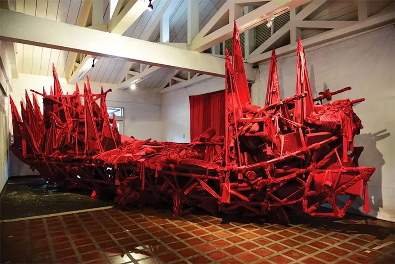 Ironically, the large-scale assembly made up mostly of wood pieces, painted in dark red, takes the form of a boat, with its geometric lines and shapes suggesting that it may have been beached in shallow water. Joining the wood pieces as his usual steeple forms from an earlier wagon series are perforated angle bars, velvet, PVC pipes, foam, iron wire, etc. Now resembling petrified masts, a subtle option may be to imagine it as having turned into a sandbank itself.