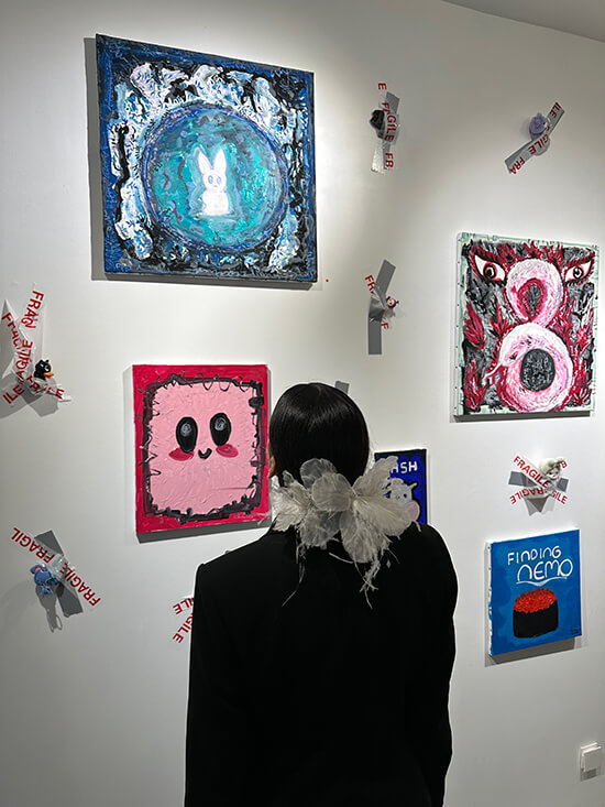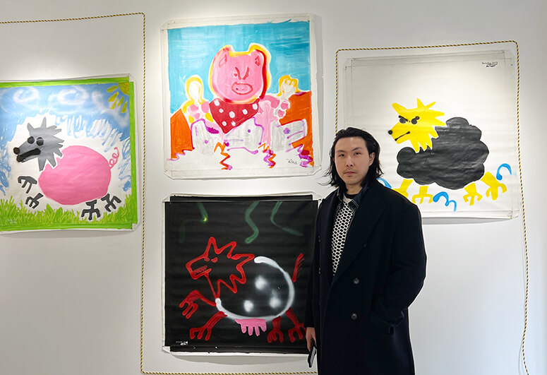 He describes his “artistic methodology as a combination of cultural artifacts, ranging from children’s parables to biblical narratives. His canvases include Barbie and Lego, remixing them with Optimus Prime and Japanese anime, as well as his favorite Filipino food. Spray paint and crayon textures create “a calculated childlike tone.”