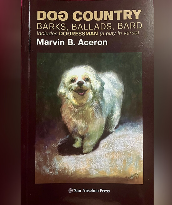 Recently launched locally was a slim but entirely entertaining book that offers poetry of levity, satire, parody, and warm engagement. Celebrating “doghood”—the realm of man’s best friend—is Dog Country: Barks, Ballads, Bard—Includes Dogressman (a play in verse) by Marvin B. Aceron, published by San Anselmo Publishing, Inc. It has 25 poems and “A One-Act Verse Play in the Parliament of Animals).”