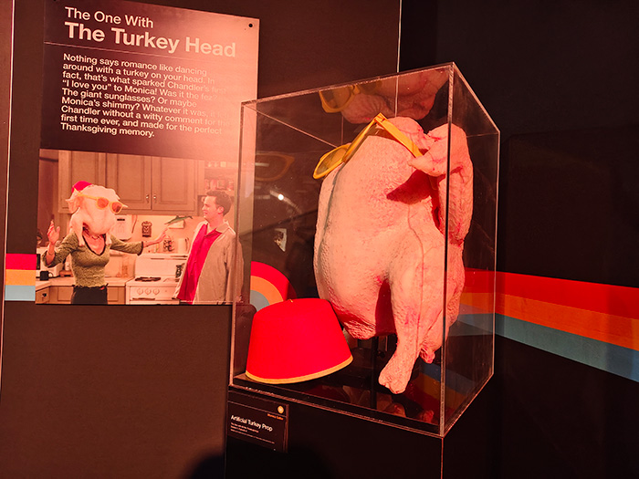 Look for the famous Turkey head with sunglasses that Monica wore to apologize to Chandler (and where he first said “I love you”) in The One with All the Thanksgivings, displayed in one corner.