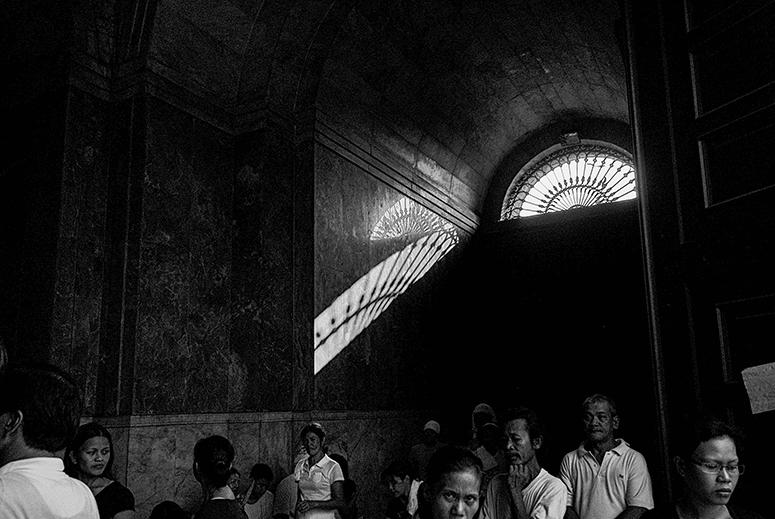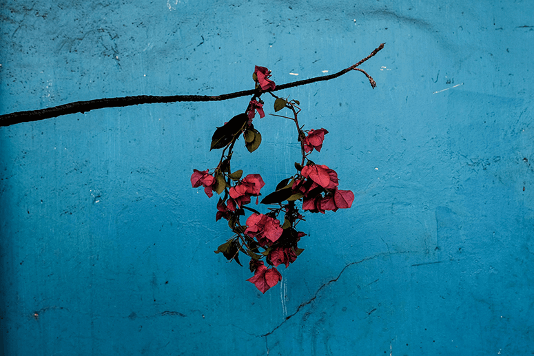 Amidst stark, black and white pictures, an image by Villafranca calls out to me—his only image here in color. A wreath hangs on a branch against a bright blue wall. Its spiny branches remind me of Jesus’ crown of thorns. Villafranca shot the picture during Holy Week, when Filipino devotees reenact Christ’s crucifixion in gory displays. This crown, however, contains no bloodstains. Instead, it blooms with pink flowers.