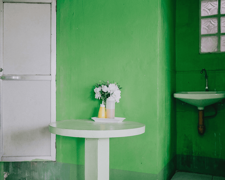In his photos of restaurant and bathroom interiors, Verzosa pays striking attention to color and thoughtful—even eccentric—decor. Apple green paint enlivens a bathroom; a restaurant wall transports one to a golden desert. These images have no people, but they are imbued with traces of a stranger’s care. Atop a table inside the green bathroom, someone had placed white flowers. As if to say: the journey may be harsh and the world may be burning, but let me make this humble place, this five-minute rest, as lovely as I can for you.
