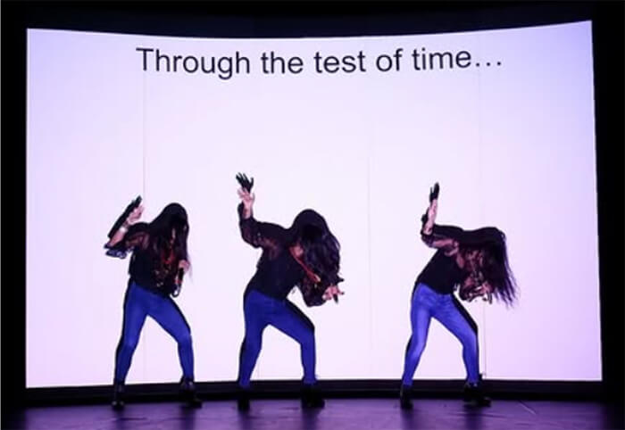 Fittingly, the band’s performance starts with a medley of popular “diva” hits, remixed and chopped up to the point of stuttering. We are finally introduced to Jocson, Cadag and Casuay, singing and gesturing small phrases from the mix of Beyoncé and Celine Dion snippets. Is the stuttering a response to the endless medley form? Through the band’s deconstructed execution, the audience is given the opportunity to inspect the choreographic conventions usually employed by Filipino biriteras. The section eventually ended with the three women shimmying to stage right to get water, apparently ending the set. But no: they returned to the stage, water bottles in hand, and drank their water with flair, in perfect unison. The audience bursts into laughter. Clearly, there is no need to take the show too seriously.