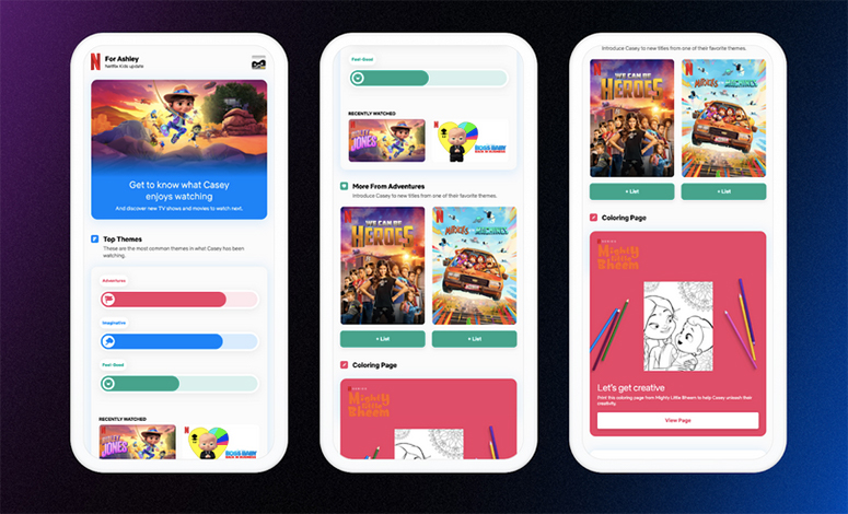 First, there’s a biweekly recap email sent out to parents to give them a better idea of what their kids like to watch, including discussion of themes, further recommendations and printable coloring sheets and activities inspired by their favorite characters, as a way to bring the family-viewing experience to real life.