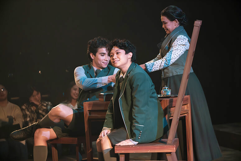 What is just as dangerous is when students are taught to learn by rote and accept whatever the teacher says without learning to think on their own. This doesn’t hold water with the rebellious Melchior Gabor (Alex Diaz alternating with Nacho Tambunting, both excellent, with the former displaying more of the character’s aggressiveness and arrogance and the latter highlighting his intellectual confidence ) who questions his teacher, Herr Sonenstitch (Audie Gemora playing all the adult male roles with nuanced, distinct characterizations), for harshly chastising his friend, the nervous and anxious Moritz Stiefel (Omar Uddin alternating with Nic Chien), prompting the elder to hit him with a stick.