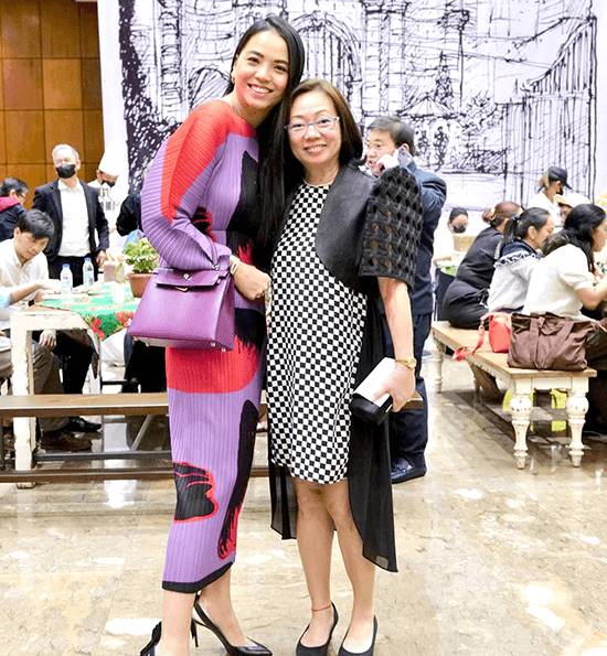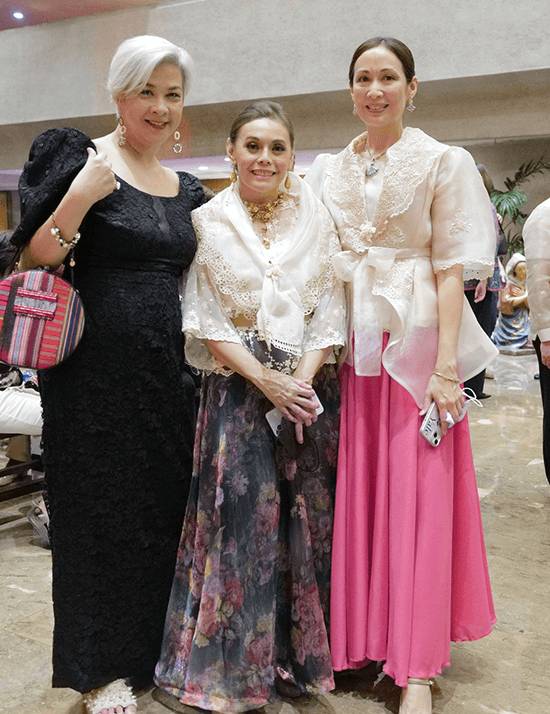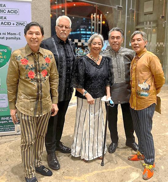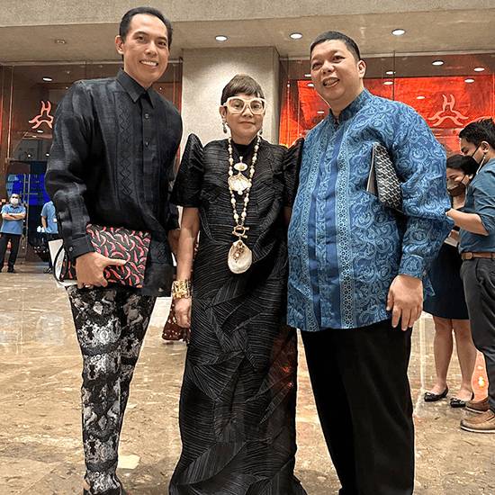 Black was a favorite color for the ternos that evening. Liza dela Fuente, who played the love interest of Lolo Val in the Zoom video, wore a full-length one with an ethnic woven bag in vivid colors. Ann Ong’s textured terno by Philip Rodriguez was the perfect canvas for her statement jewelry. Myrza Sison went mini with a bolero by Edgar Madamba. Kourtney Camcam got her terno top online, while her stretch pants were 25-year-old DKNYs that proved the most comfortable after her pregnancy. Her preferred jewelry is Pagari, “an advocacy-driven brand providing skills and livelihood to the widows left behind in Marawi.”