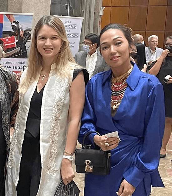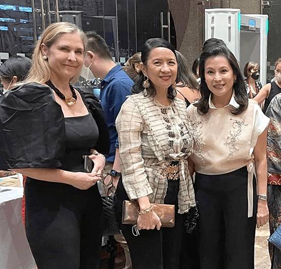 Fine Philippine craftsmanship was very visible with artisanal pieces like Lulu Tan Gan’s embroidered piña top with lace inserts worn by Mia Borromeo, which she paired with a brass inlaid wood minaudiere. Evelyn Uy wore Ditta Sandico’s terno in abaca fiber. Anna Periquet commissioned Lumban embroidery for her ensemble. Designers Pando Manipon and Tony Cajucom wore barongs with couture details and beading.