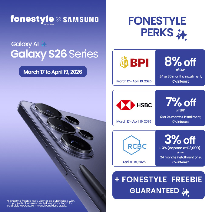 Local one-stop gadget shop Fonestyle has exciting offers in store for the Galaxy S26 launch from March 17 to April 19, including up to 8% off when you use BPI, HSBC, and RCBC credit cards. Also up for grabs are varying freebies to pair with your new phone, like USAMS earbuds, USAMS power bank, REMAX adapter, and more.