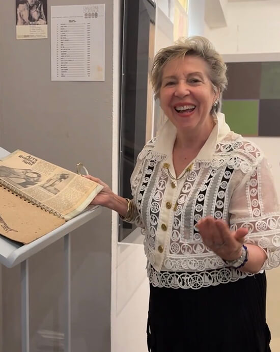 She laughs at her displayed scrapbooks, handmade collections of xeroxed photos and clippings. “A real archivist would say they’re not kept well.” Yet she’s kept all the press stories over the years, the price lists, the invitations.